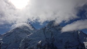 But… the morning didn’t end with a descent through whiteout. The skies around us cleared leaving one stubborn cloud sitting on top of the glacier obscuring a perfect view of Everest, and as that cloud was slowly torn apart by the valley winds and morning sun, Everest shown through like a God announcing his presence to the world. We sat in awe at the climax of our trek.